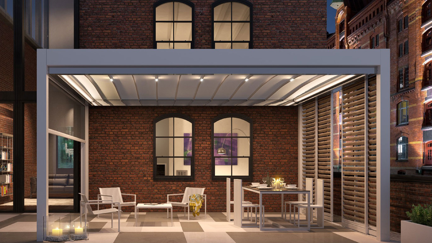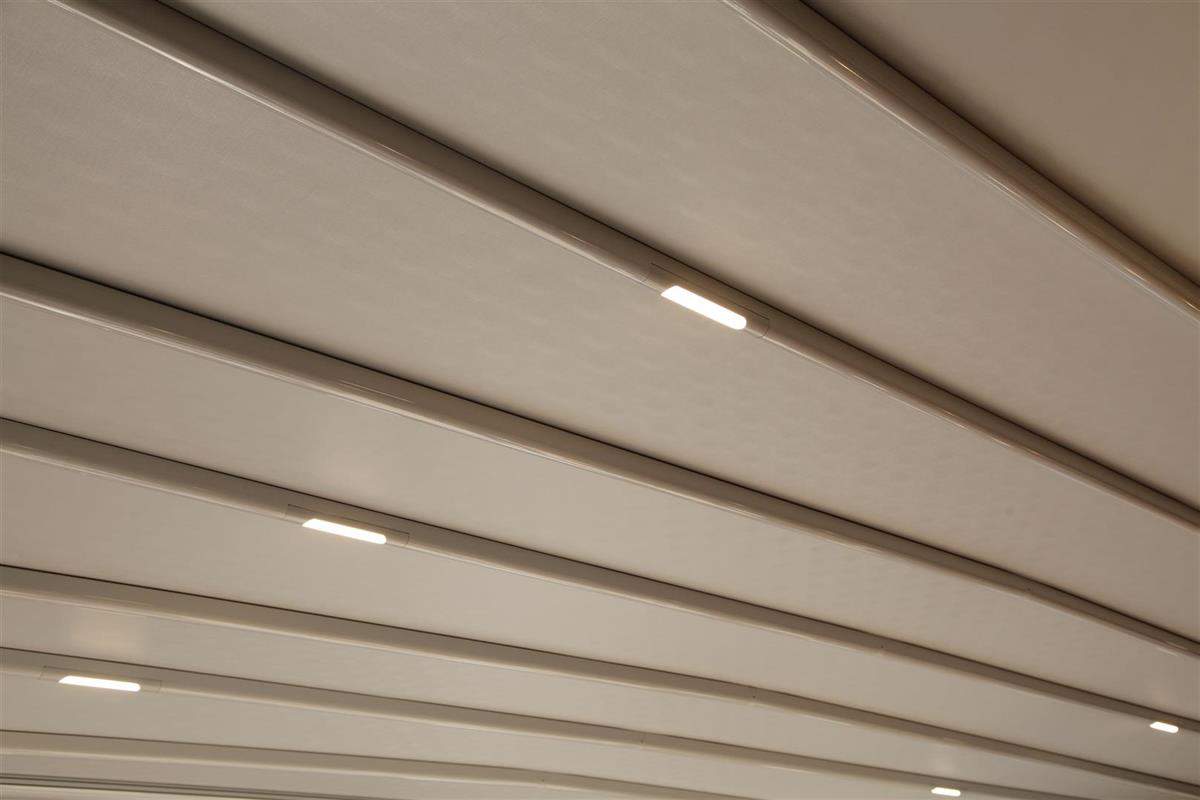 L’illuminazione integrata con LED RGB dimmerabili e luci LED consente di personalizzare l’atmosfera, mentre i sensori per vento e pioggia rendono il sistema sicuro ed intelligente, automatizzando l’apertura e la chiusura della copertura in base al meteo.