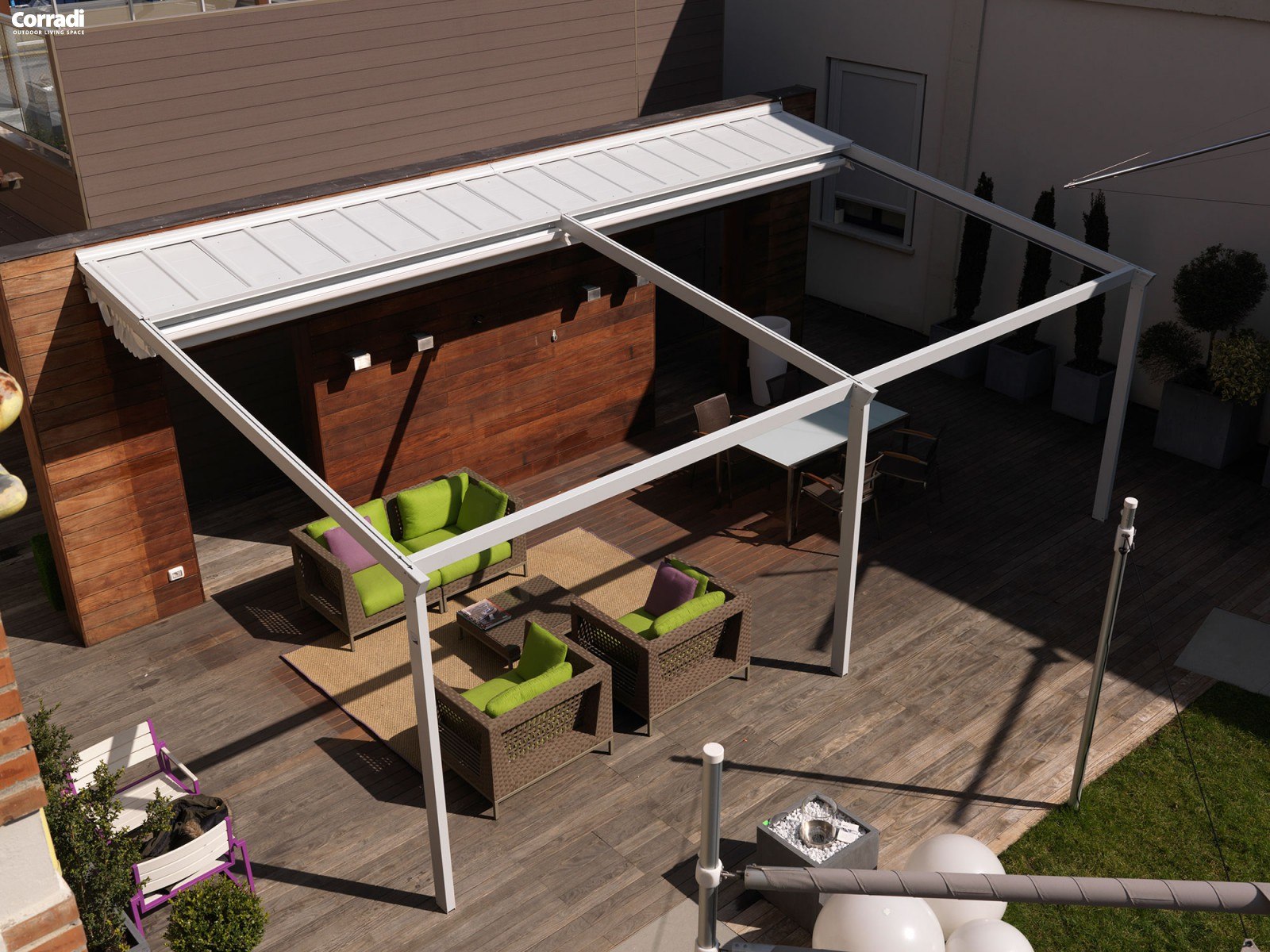 Il sistema prevede una tenda in PVC Eclissi multistrato motorizzata, a impacchettamento, che permette di gestire facilmente la copertura in base alle esigenze di utilizzo ed alle condizioni climatiche.